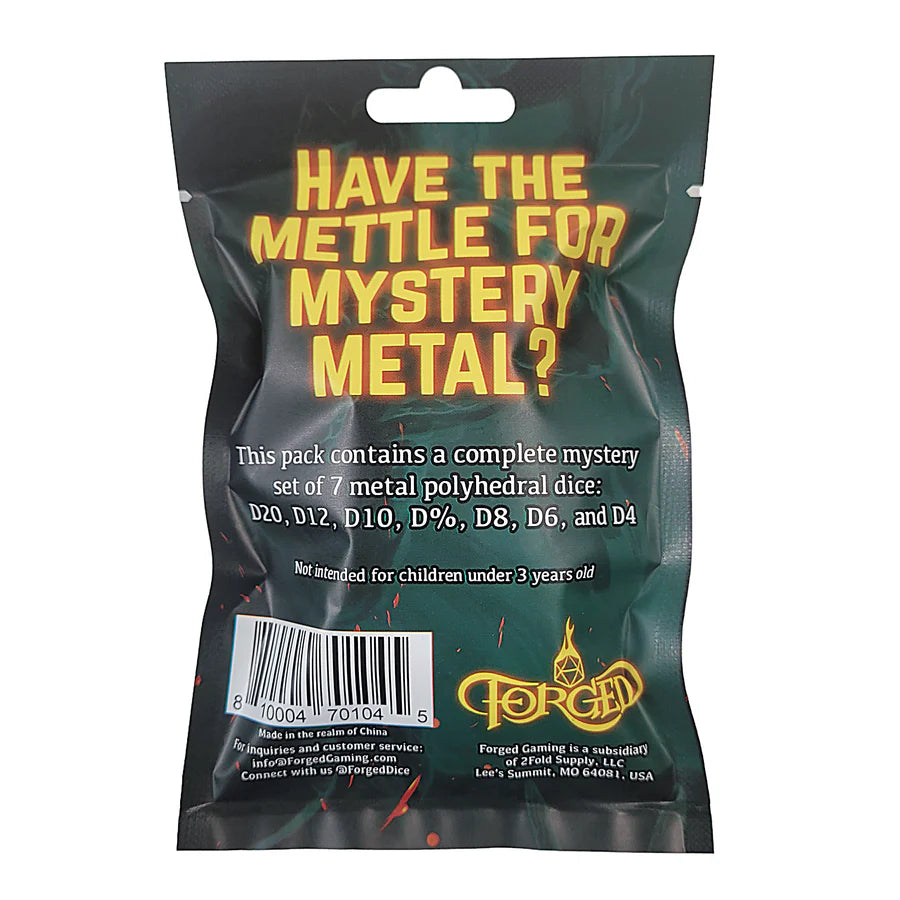 Have the Mettle for Mystery Metal? Within this bag is one of ten sets of Forged Dice Co Metal polyhedral dice. Its color and chroma await discovery by only the boldest. Do you possess the fortitude to take a chance?